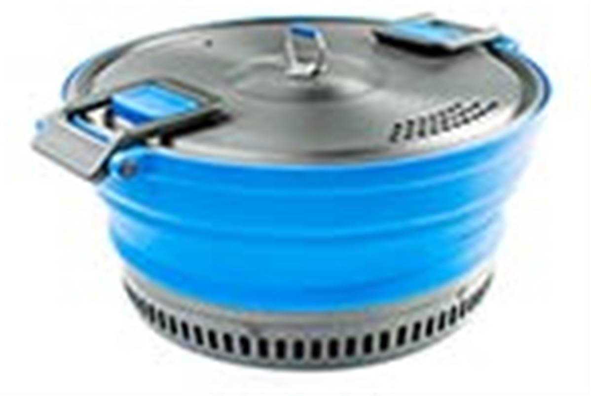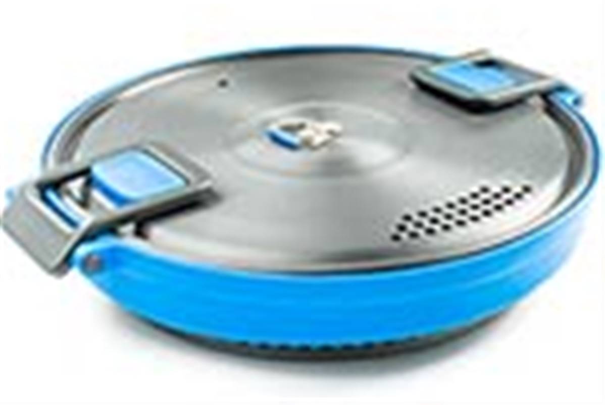 Casserole de camping bleue 2 L en silicone pliable incroyablement efficace, fond et couvercle en aluminium anodisé dur avec revêtement Teflon™ anti-adhésif. (Poids: 500g)