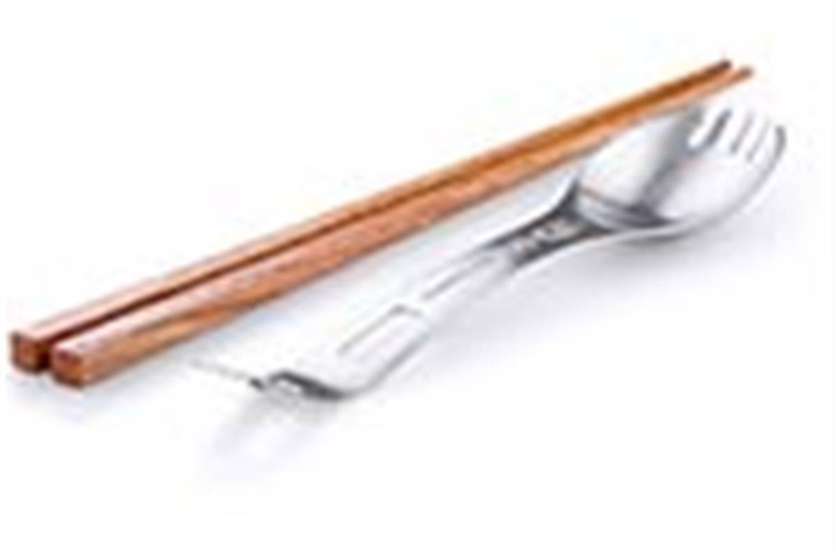 Couvert de camping multifonction, baguette et fourchette-cuillère possibilité de faire un couvert à long manche pour les pots hauts et les sacs de plats préparés.